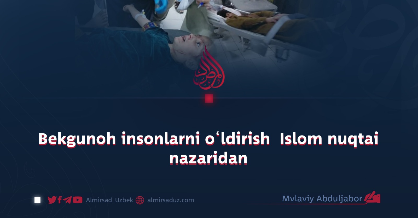 ldin Arabiston jahiliyat davrida turli muammolar va katta qiyinchiliklar bilan yuzma-yuz edi. O‘sha davr odamlari inson qadr-qimmatini anglamas edilar. Ammo Rasululloh sollallohu alayhi vasallam o‘zlarining kelishlari bilan ularga Islom rahmat, adolat va insoniylik dini ekanini tushuntirdilar. Islomda inson hayotiga shunday yuksak maqom berilganki, nohaq bir insonni o‘ldirish butun insoniyatni o‘ldirish bilan teng deb hisoblanadi. Shu sababli begunoh va oddiy odamlarni o‘ldirish nafaqat katta axloqiy jinoyat, balki shar’iy jihatdan ham katta gunohlardan hisoblanadi.