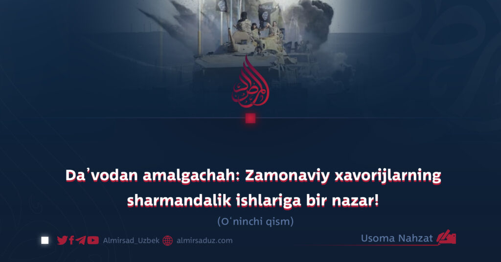 Da’vodan amalgacha: Asr xavorejlarining sharmandali amallari maqolalar turkumining davomida biz bu safar ushbu guruhning eng eski va takroriy da’volaridan biriga to‘xtalamiz ya’ni amalda mutlaqo haqiqatdan yiroq bo‘lgan bir da’vo, xavorejlikning asosiy belgilaridan biridir.