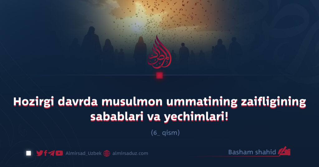 Usmoniy xalifaligi kofirlar qo‘li bilan qulatilib, tarix sahnasidan yo‘q bo‘lgach, bu holat ham musulmonlar zaiflashuvining muhim omillaridan biriga aylandi. Islom mamlakatlari dushmanlar hukmronligi ostiga tushdi, musulmonlar esa mayda hududlar va kichik-kichik davlatlarga bo‘linib ketdi. Dushmanlar aynan shu xalqlar ichidan o‘zlariga xizmat qiladigan shaxslarni tanlab, ularni musulmonlar ustidan hukmron qildilar; ular musulmonlarni bosim ostiga oldilar, xor va zalil etdilar hamda ularning iqtisodiy boyliklarini kofirlarga topshirdilar. Agar kimdir kofirlarning zulmi va tajovuziga qarshi himoya yoki norozilik ovozini ko‘tarsa, u yoki o‘ldirildi, yoki qamoqxona panjaralari ortiga tashlandi.