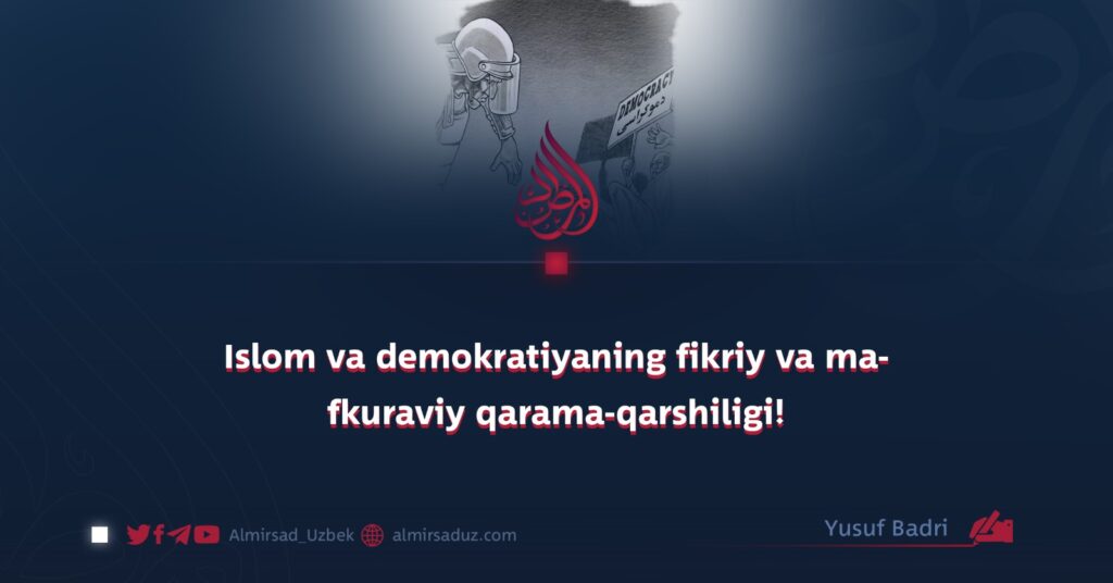 Demokratiya zamonaviy dunyo tushunchalaridan biri bo‘lib, insoniyatning najoti nomi bilan dunyoga taqdim etilgan va eng ko‘p targ‘ib qilinib, maqtalgan tizimdir. Bu nizoм xalq hokimiyati shiori bilan oldinga chiqqan, biroq uning orqasida kufrning, istibdodning istismorning va ilohiy nizoмga ochiq dushmanlikning qorong‘u niyatlari yashiringandir.